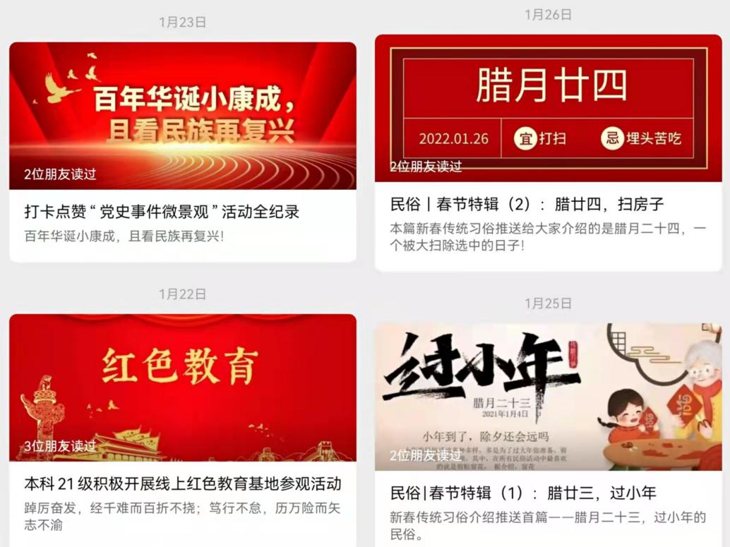 宣传教育,补足精神之钙。学习不止步,成长不延期,寒假期间的宣传教育同样不可缺席。1月29日,全国劳动模范、全国五一巾帼标兵冯艳员工,为近300名本硕博同学们开讲了“E友亦师”第一场微讲座“传承工匠精神,在新时代电网发展新征程中展现新作为”。学院团学推出“E起过寒假”系列推送,陪伴电院学子在假期里更加自律,进阶自我,团学不断追求原创,贴近平凡朴实的生活,努力实现与读者共鸣,共频,共振。本科2020级、本科2021级公众号发表寒假计划及生活分享推送,鼓励员工坚持学习,充实自我,度过一个丰富、有意义的假期。本科2021级公众号持续推出新春民俗文化介绍15期,带领同学们了解各地春节习俗,增强文化底蕴;同时,发表线上红色教育基地参观活动总结和微景观打卡活动总结,记录同学们的实践活动,以此鼓励员工持续树立“学党史,跟党走”的信念,肩负历史使命,坚定前进信心。