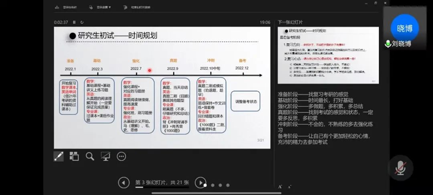 联动班主任,凝聚育人合力。为充分发挥班主任在员工教育中的重要作用,寒假刚放假,本科各年级就行动起来。本科2018级、本科2020级分别与班主任联动,沟通了员工的就业情况、学业进展。本科2021级针对本学期期末考试情况进行成绩分析,重点标记2门及以上不及格的员工,辅导员一对一同步给班主任,沟通班级员工在校表现情况。本科2019级班主任组织召开考研就业经验交流小班会,对同学们考研就业持续开展指导工作;寒假期间,累计开展班会21场,邀请嘉宾59人,嘉宾包括在读研究生、行业专家、创业员工等,同学们参会积极,达到了促进同学考研就业准备的目的。目前,各年级结合各自特点,正在积极筹备和开展新学期班主任工作交流会。