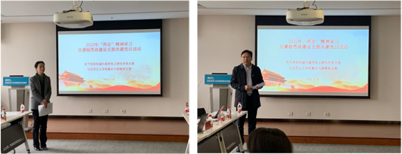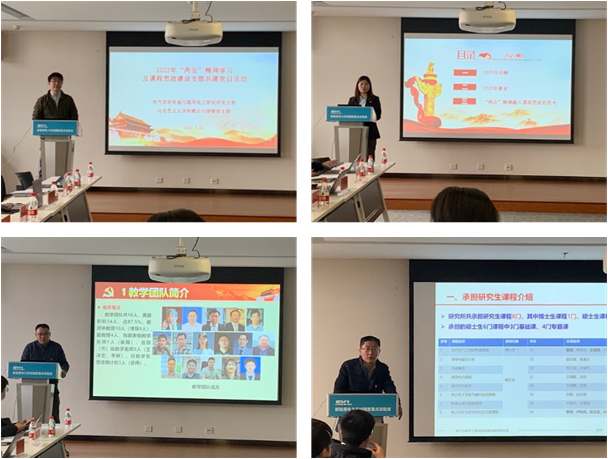 电子与电子工程学院电磁与超导电工研究所教工党支部书记李学宝、马克思主义学院概论与纲要党支部骆小平、电磁与超导电工研究所副所长皮伟以及电磁与超导电工研究所所长赵志斌分别介绍了各自支部情况、本科生、研究生课程概况及课程思政情况。其中骆小平分享了2022年“两会”精神学习及融入课程思政探讨。希望通过领悟两会精神,结合中国特色社会主义的伟大实践,深入挖掘课程相关内容,寻求合理切入路径。