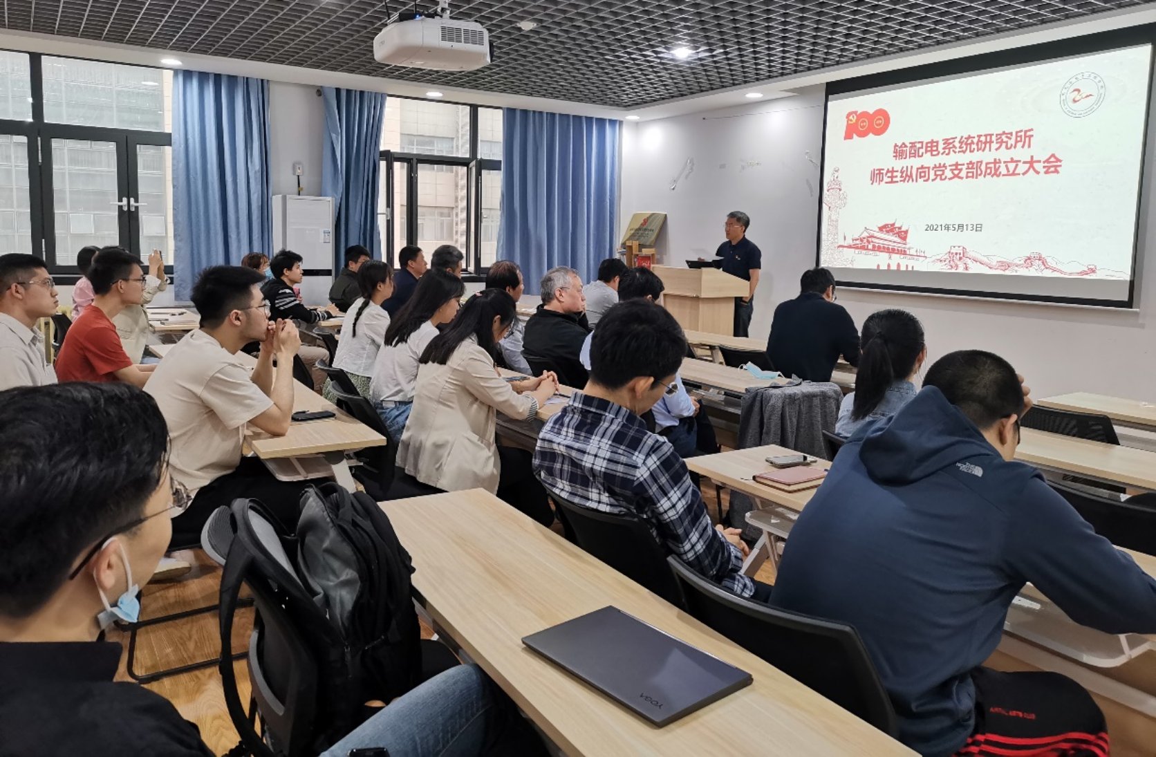 全体参会人员一同观看人民日报新媒体推出的建党百年主题MV《少年》。之后,输配电系统研究所师生纵向党支部书记刘念介绍了支部的成立初衷、建设目标和建设思路。支部在党建引领事业发展、服务国家能源安全战略、以及科教融合协同育人方面成效卓越,获评全国“双带头人”教师党支部书记工作室,并依托工作室建设师生纵向党支部,以保障电网安全为特色,以育人小循环、服务国家战略需求大循环的“双循环”体系为建设架构,落实“党建强基”、“凝心聚力”、“创新攻坚”三大工程,打造以党建引领驱动“科研、教学、育人”多维协同发展的党支部样板。