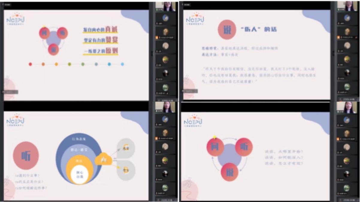 余小霞以“老师和同学的谈话需要什么”这一问题引入,从“问”“听”“说”三个层面进行了分享。她结合实际工作指出从舒适的日常对话开始,让员工感受到互相交流的价值所在是心理健康工作顺利开展的前提。“洋葱图”形象地向大家展示了老师应该透过行为表象了解员工的感受、想法、期待,进而看到员工的核心自我。余小霞还结合自己作为班主任与员工交流的亲身经历和研究生导师以及班主任的实际工作情况,同老师们进行深度探讨:表达是为了让同学们自我反思,不带批判性地让同学们清楚自己的行为对周围人所造成的影响,并从如何说“伤人”的话、“建议”的话与“肯定”的话三方面为与会老师们提供参考。此外,余老师指出与人交往的三大准则——“发自内心的真诚”“坚定有力的赞赏”“一以贯之的原则”,给与会老师提供了实操性极强的心理工作方法。