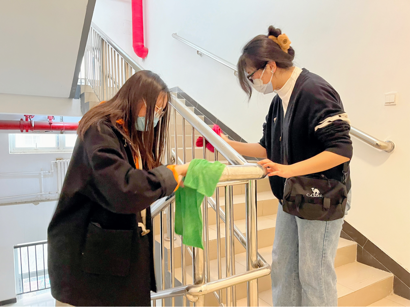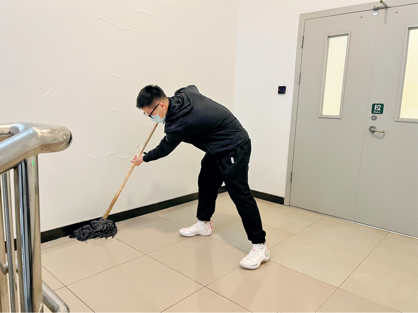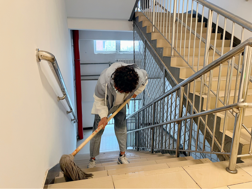 为了减轻工作人员的负担,为老人们提供更为舒适的生活环境,志愿者们还积极完成了卫生清扫工作:几位同学分工合作,拖地、擦拭栏杆、清洁桌椅和门窗,在楼道、浴室和卫生间里默默劳动着,认认真真打扫了每一个角落,使养老院变得更加整洁温暖,充满家的气息。