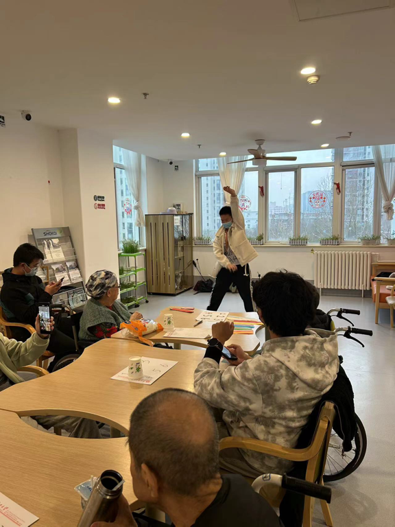 志愿者们也带来了一场精彩纷呈的文艺演出。开场便由4位同学带来今年春晚火爆出圈的歌曲《上春山》,富有朝气的歌词和风华正茂的同学们也勾起许多老人的美好青春回忆;紧接着,由范勃鸣表演健身操《英雄少年》,矫健的身姿引得老人们不禁挥动起双臂,颇有“可否许我再少年”之意;最后,志愿者们在了解老人们的喜好后,合唱《我们走在大路上》等等红歌,一些老人也在充满回忆的旋律中跟唱!才艺表演不光展示了新时代老员工的多才多艺,更是直接调动起了老人们的情绪。