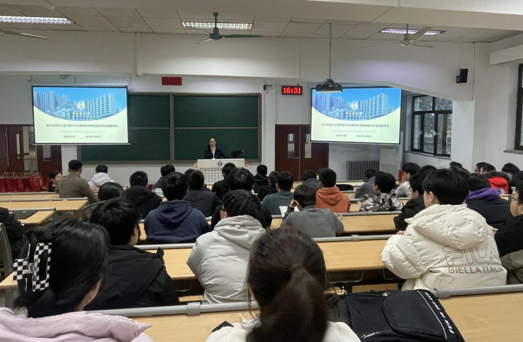 两位优秀员工代表随之分享考研冲刺经验。学院E先锋师生联合党支部刘佳文为大家分享了心态的调整方法,作息、环境、心理调节全方位覆盖,为学子驱散阴霾、鼓舞内心;同时也鼓励考生们为不同结果铺就前行之路,助学子从容应对挑战、坚定逐梦步伐。研电2408班闫腾分享了自己411分初试的冲刺攻略,从冲刺阶段每日规划、学科攻坚到错题整理、疑问解答,条分缕析,切中要点。