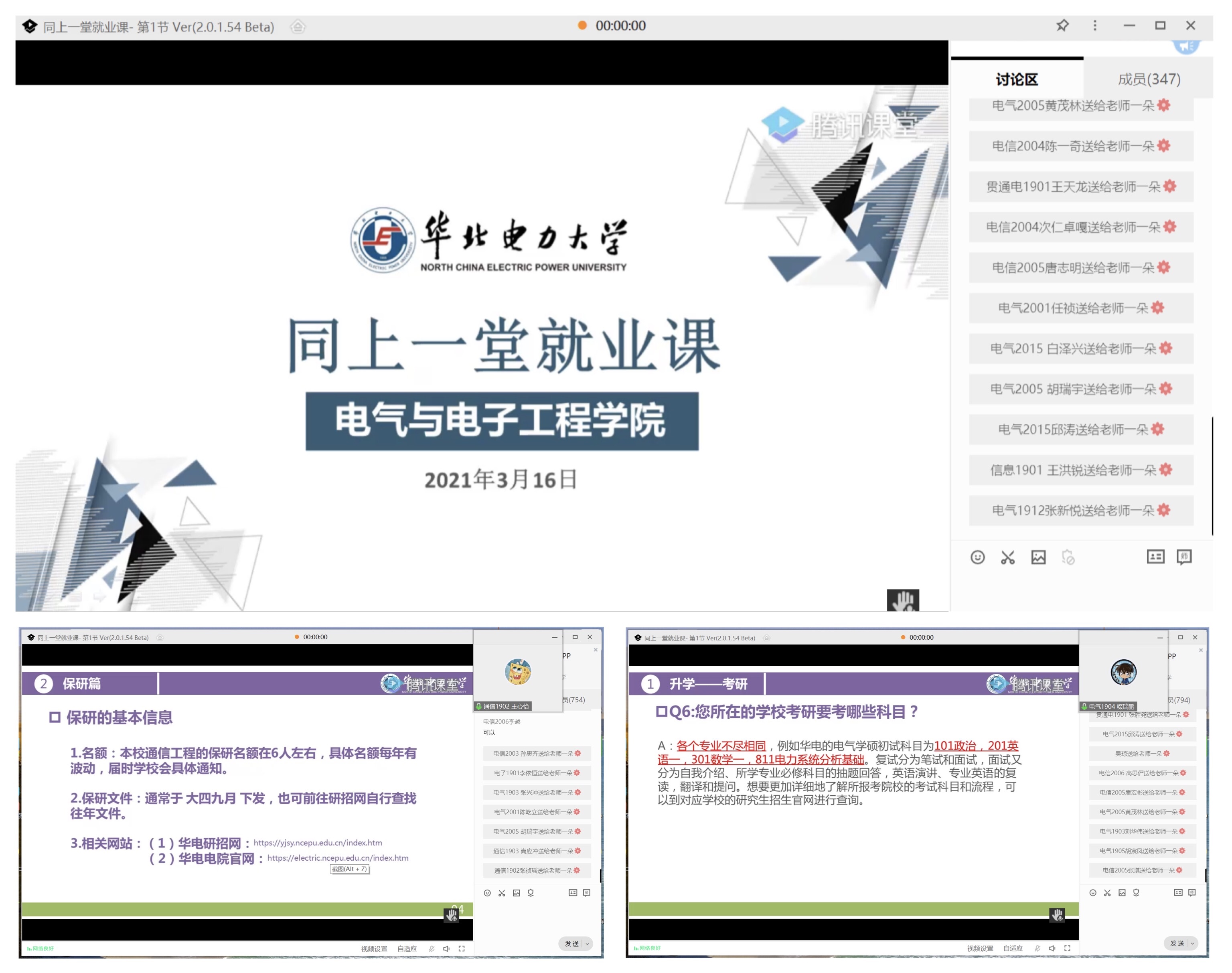 此次就业课之前,包括主讲的8名同学在内,2019级共有16名同学在学院的协调帮助下,主动策划、分组开展准备工作。他们对近几年电气、电网、通信、信息和电子各专业毕业生就业数据进行分析,收集班级同学关注的就业问题,带着这些问题,他们线上、线下分组采访了多名学院员工、本校教师、优秀本硕博毕业生,厘清了同学们关注较多的就业热点问题,然后认真备课,开展多轮试讲。有了这些准备,在此次“同上一堂就业课”活动中,不同专业的8名宣讲同学,顺畅、精彩的从就业、考研、保研、出国、学业提升等五个方面入手,将员工、老师、学长学姐对大家的谆谆教诲和殷切期盼传达给每一位同学,并以问答的形式为大家解答疑惑。同学们听讲认真,讲到精彩之处纷纷“献花”、点赞。