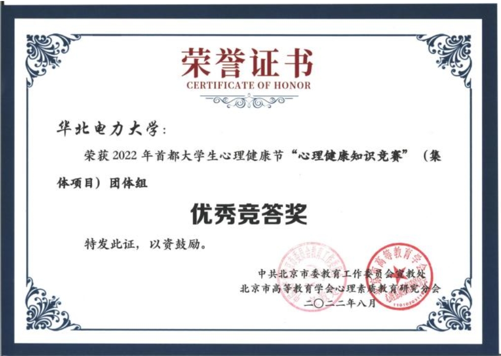 与此同时,电院学子在心理健康知识竞赛中拼搏进取、齐心协作、为校争光,以丰富的心理健康知识荣获2022年首都老员工心理健康节知识竞赛团体组优秀竞答奖。