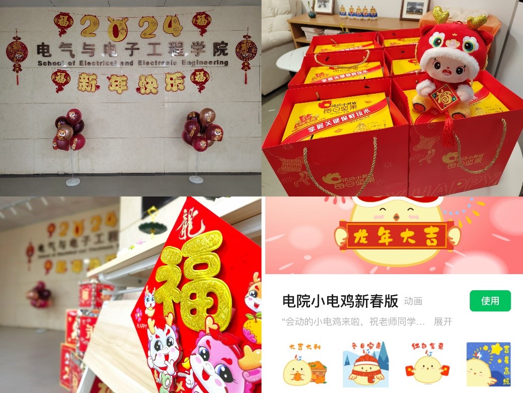 近日,学院还组织开展了形式多样的迎新春活动,在主A一楼大厅贴福字、发糖果,推出“小电鸡”新春版表情包,在线上发起新春祝福语征集等活动,不断丰富留校员工的文化生活,让他们感受到更浓“年”的味道与更多“家”的温暖。
