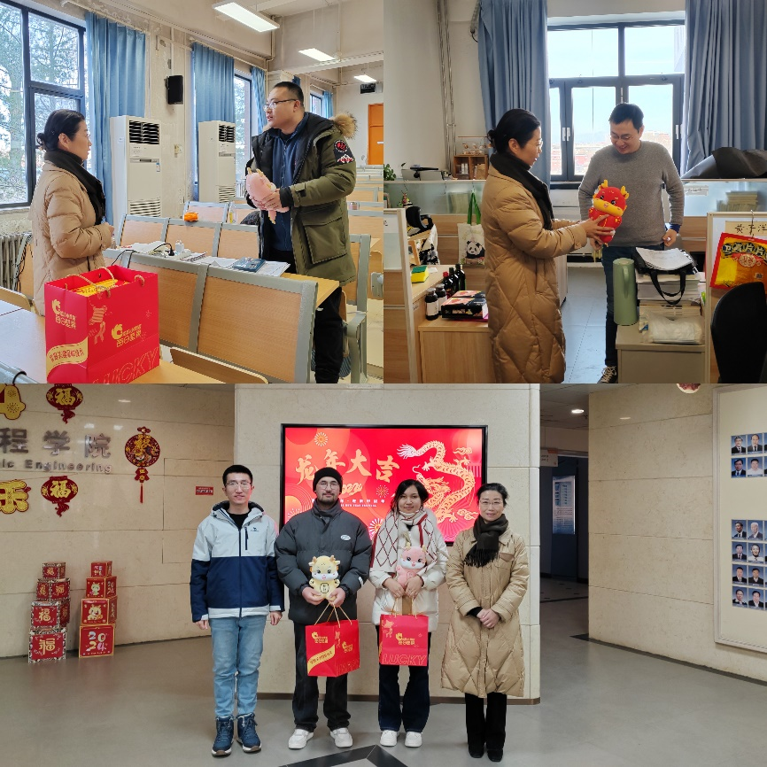 今年寒假学院共有10名员工选择留校过年,多为毕业生和博士生。卜春梅先后走访了主A与教五楼的研究生实验室,并与留校本科生见面交流,悉心询问他们的毕设进展、科研安排与就业情况。勉励他们保持学习热情,合理规划时间,多多关心父母亲人,叮嘱他们牢固树立安全意识,严格遵守学校规定,遇到困难和问题要第一时间联系学院。佳节将至,卜春梅为留校员工送上学院精心准备的慰问品,祝愿大家在平安喜乐、岁岁欢愉中迎接甲辰龙年的到来。