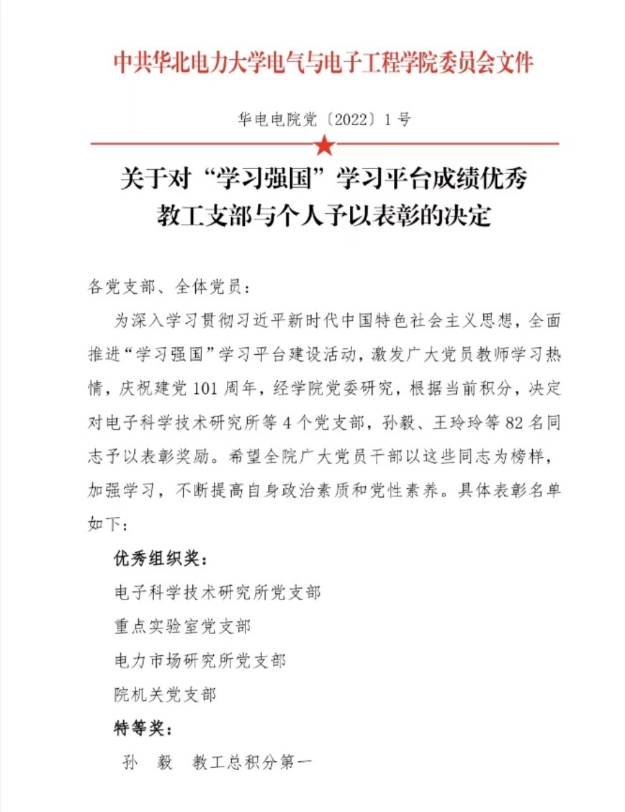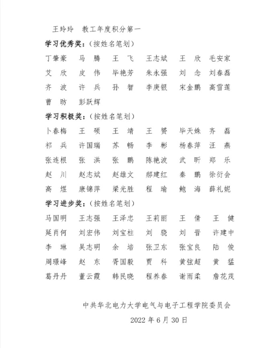 为庆祝“七一”建党节,学院各党支部积极开展特色活动。输配电系统研究所纵向党支部于6月28日召开了以支部成立一周年工作总结暨迎“七一”活动为主题的支部党员大会,回顾该支部的历史沿革,展现建设成效并对支部提出未来期许。重点实验室党支部通过观看百年风华、中共一大,中国共产党成立的历史过程等系列影片和讲座,回顾中国共产党成立之初的历史及建党以来取得的巨大成就,鼓舞师生不忘初心、奋发进取。留校员工党员积极承担毕业生档案整理工作,以无私忘我的精神奋斗于毕业离校保障服务工作的第一线,充分确保各项工作的有序开展。各员工党支部积极开展理论学习与实践活动,组织观看学习庆祝香港回归祖国25周年大会暨香港特别行政区第六届政府就职典礼,深刻领悟中国共产党一百多年来开辟的伟大道路、创造的伟大事业、取得的伟大成就。电院学子纷纷表示必将不负韶华、不负时代、不负人民,为维护祖国统一,实现中华民族的伟大复兴付出自己的一份力量。