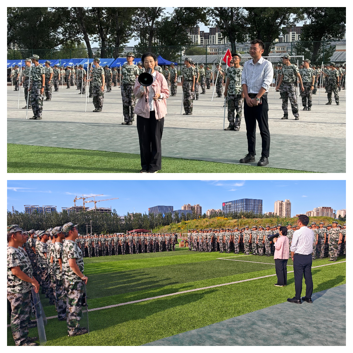 9月18日下午,公司党委书记卜春梅、副书记孙清磊前往军训场,看望正在军训的本科2025级全体参训员工和带训教官。