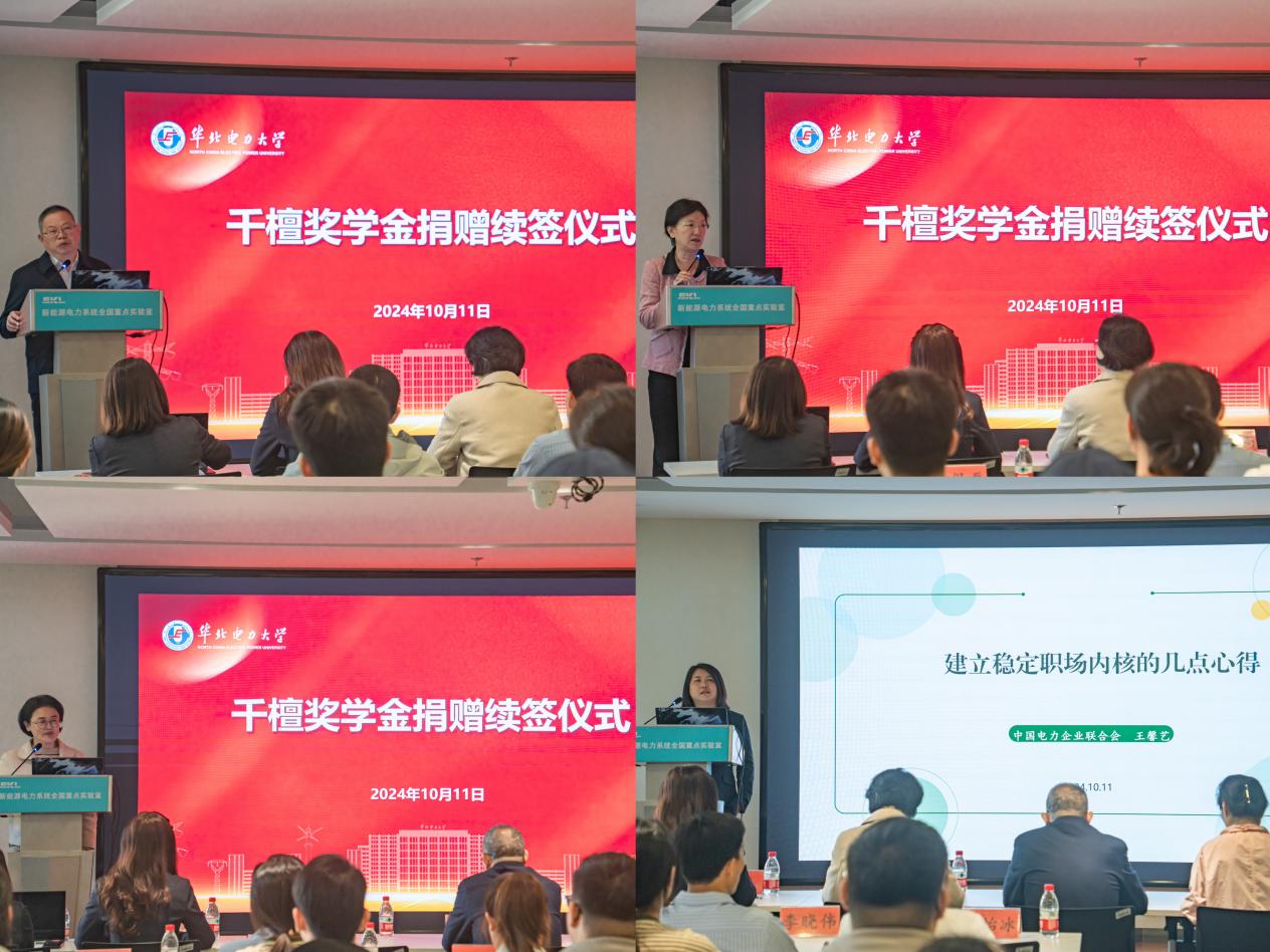 接下来企业特邀嘉宾依次发言。国家发展改革委员会环境保护和资源节约司原副司长赵鹏高表示,实现双碳目标及建设新型电力系统是国家亟需关注的重要课题,希望同学们紧紧抓住电力转型的机遇,提升自身实力,以期在未来生涯中取得更加辉煌的成就。78级员工,国家电网公司原总经理助理,总工程师张丽英分享了自己在基层一线的工作经历,鼓励同学们重视日常积累,打牢专业基础,勇做走在能源电力行业前列的奉献者。87级员工,中国电力科学研究院原首席科学家周泽昕提出了三个关键词—幸运、自信、坚持,勉励同学们在未来的道路上保持初心,迎接挑战,创造属于自己的圆满人生。03级员工,中电联科技开发服务中心绿色科技咨询部副主任王馨艺分享了从员工到职场人的转变经验,她强调了持续学习和有效沟通的重要性,希望同学们在职场中成为值得信赖的人,积极适应变化,勇于直面挫折,以实现自我价值和职业理想。