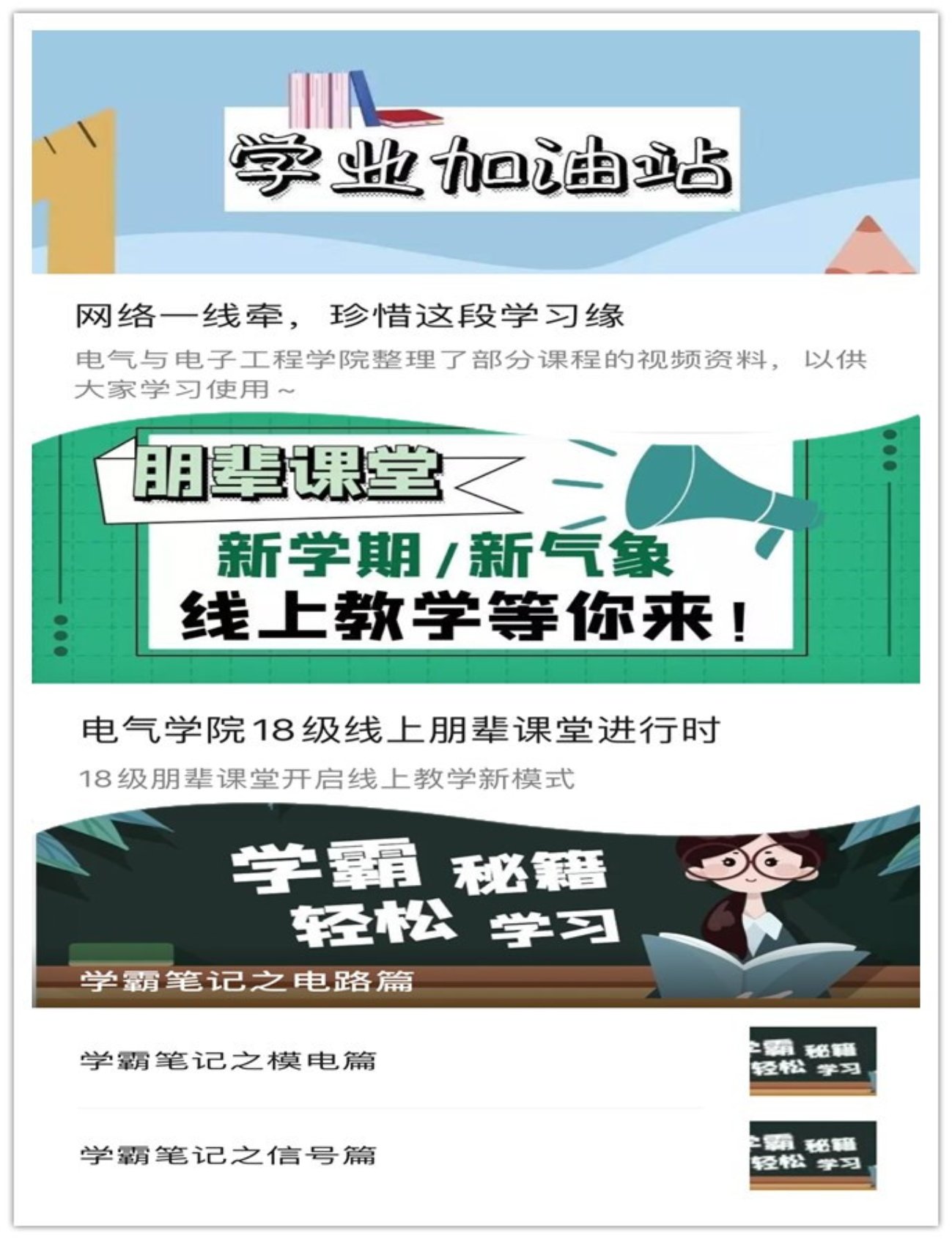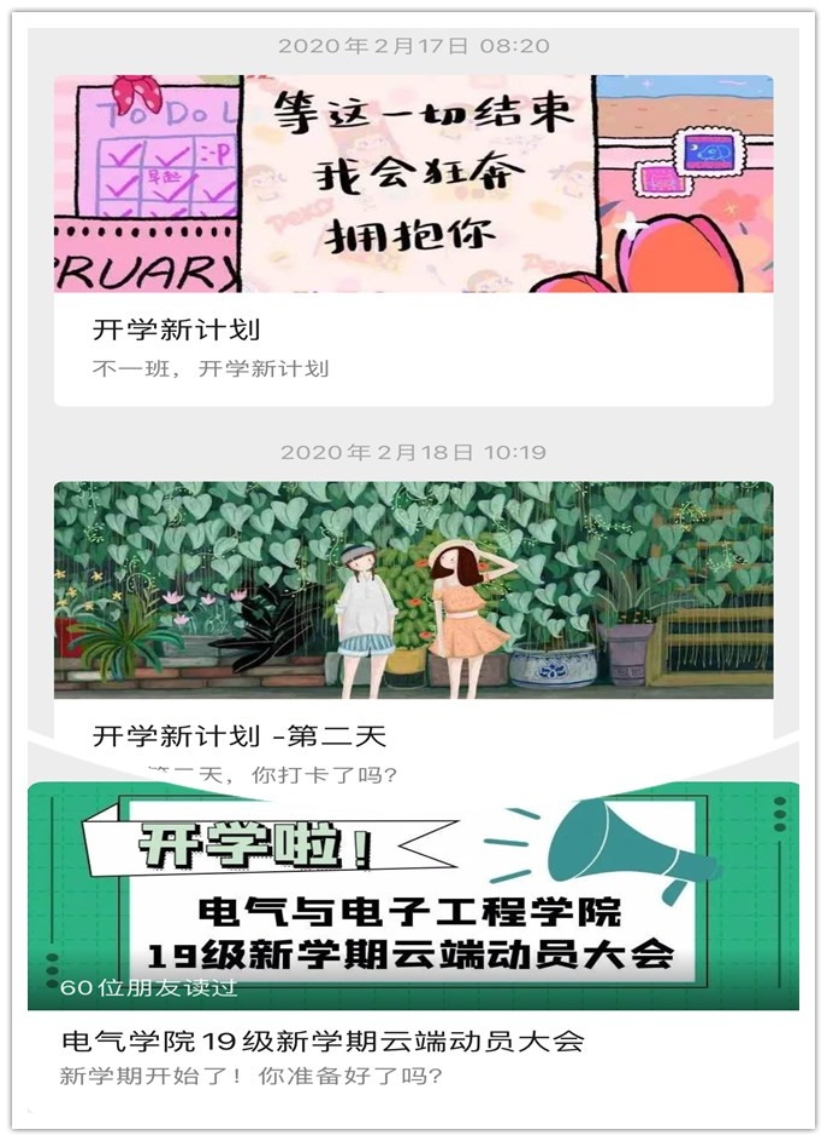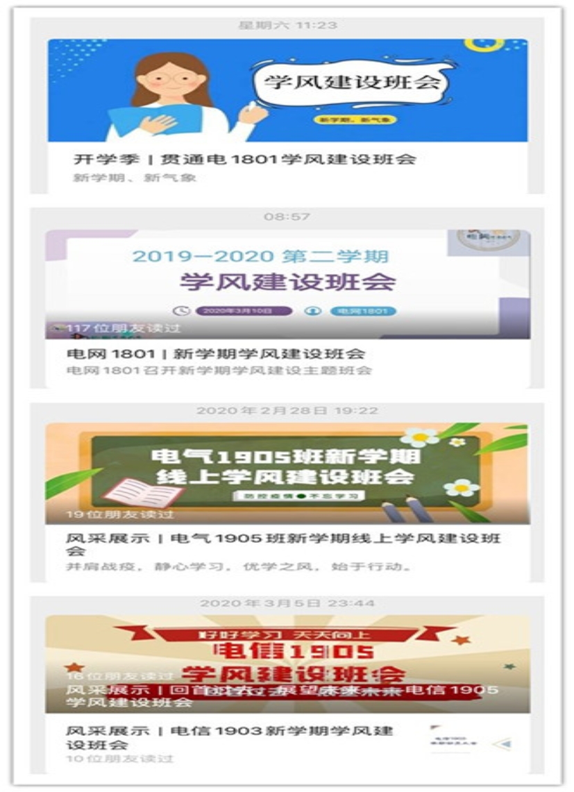 “停课不停学,防疫不妨学”。电气学院各年级将学风建设作为疫情防控期间的重点工作,开展了一系列形式多样、成效显著的促学助学活动,助力员工调整状态、收心归位,更好地适应线上教学,规划科学健康的学习生活。其中,电气1801班聚焦特殊时期同学们的不同需求,推出“开学新计划”特别企划,通过“课程学习”、“艺术拓展”、“运动健身”和“好书推荐”等多个模块,用轻松愉悦的形式向同学们提供特殊时期的学习生活指南,实现自主学习与身心健康双促进。2019级召开“新学期云端动员大会”,辅导员与各班员工干部共同回顾上学期的成绩与不足,横向对比分析各班成绩与表现,明确优势,找到差距,同时规划新学期的工作,做到“一班一策”助力线上教学,完成“停课不停学”期间的各项学习任务。各年级各班级召开线上学风建设主题班会,班主任带领员工进行学期总结、成绩分析、经验交流、制定计划等等,营造勤学上进的学习氛围。