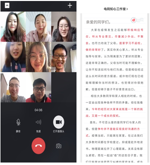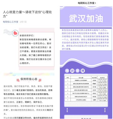 在知心工作室的协助下,由员工党支部成立专项心理小组,定期于疫情严重地区的同学进行线上连线,倾听同学心声,重视同学心理变化,分享思考体悟,传播健康理念、舒缓同学们的情绪。积极发挥学科和专业优势,传播心理健康、居家锻炼运动、健康作息等知识。挖掘身边平凡人的抗疫故事,抒发抗击疫情期间难以忘怀的坚守、携手并进的奋战、守望相助的关爱和万众一心的感动,增强抗疫的信心。