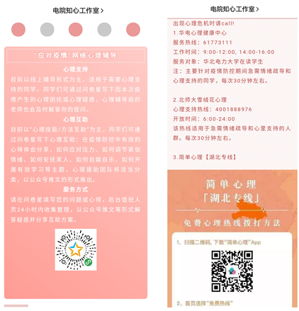 为将网络心理辅导覆盖到每一位员工,知心工作室发布多篇“心理处方”,普及心理健康知识,引导员工加强心理防护,在疫情面前注意增强自身情绪状态的觉察,多与家人进行沟通互助,及时调节消极情绪。积极动员心理委员参与线上心理服务培训课,积极发挥“同伴教育”和“朋辈辅导”的辐射作用,使他们看待心理服务工作的思维和视野得到拓展,树立主动服务意识,积极作为,更好的帮助周边同学。